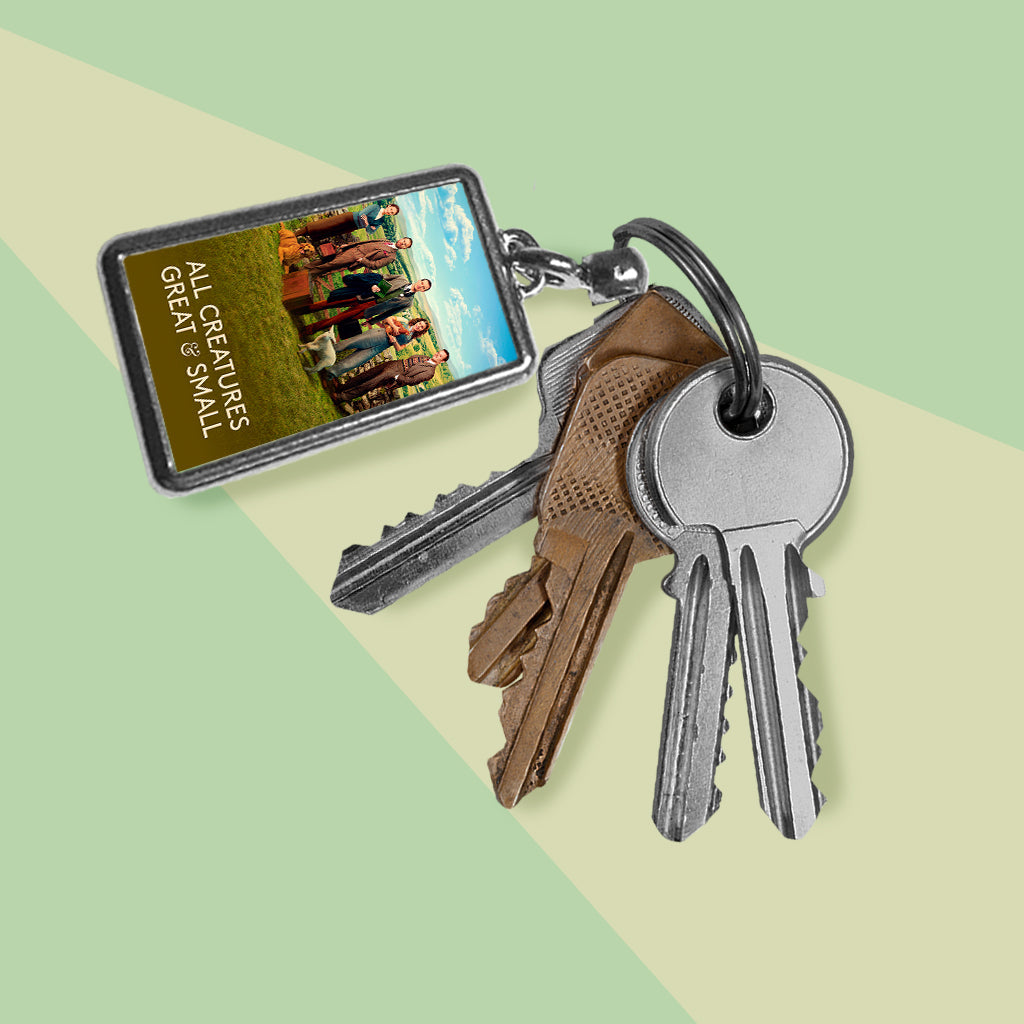 Carry the charm of the Yorkshire Dales with you wherever you go with this All Creatures Great and Small Cast Group Keyring. Featuring a vibrant print of the beloved cast, this high-quality metal keyring is the perfect accessory for fans of the iconic series. Whether you're adding it to your keys, bag, or backpack, this keyring is a stylish way to show off your love for All Creatures Great and Small.