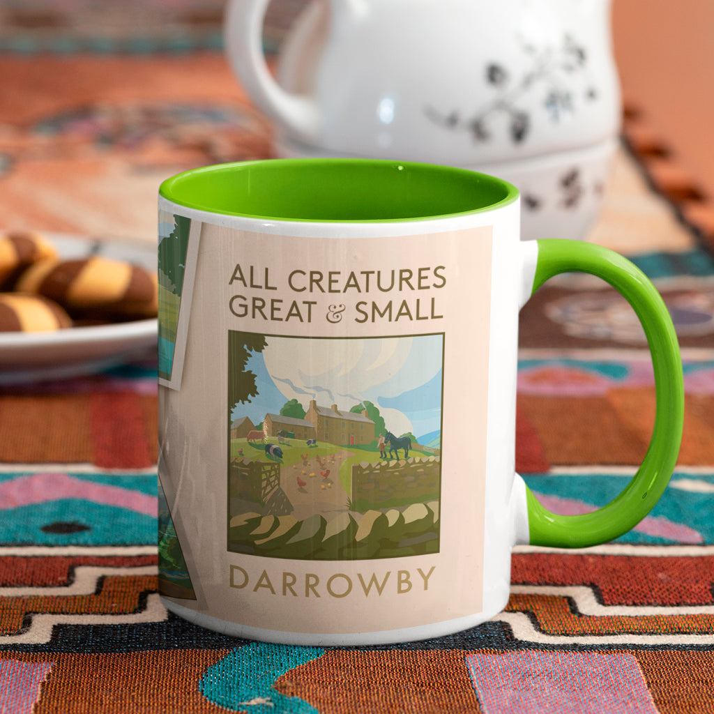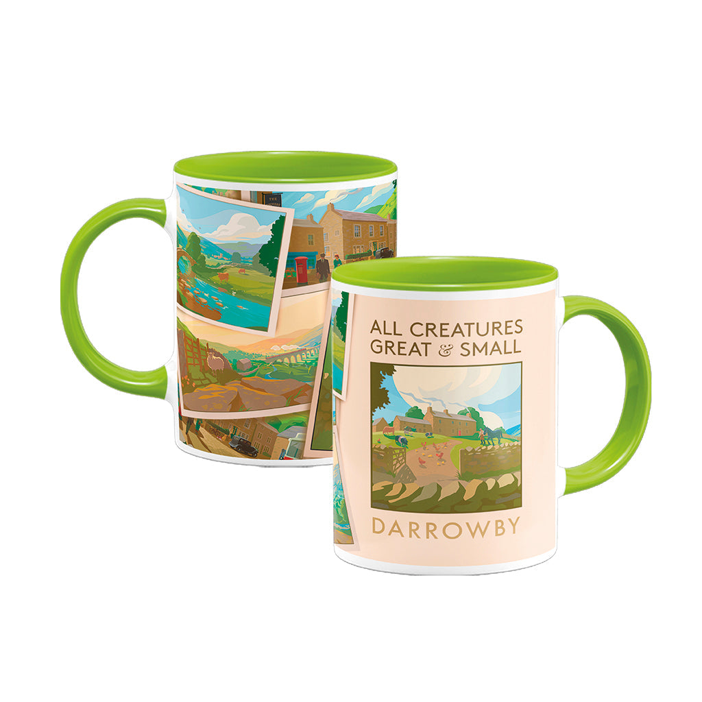 Capture the beauty of the Yorkshire countryside with the All Creatures Great and Small Darrowby Scenic Mug - Green Interior. Featuring a stunning illustration of the peaceful landscapes surrounding Darrowby, this 11oz mug is the perfect way to bring a touch of the countryside into your home. Whether you're enjoying your morning coffee or unwinding with a warm tea, this mug will transport you to the scenic beauty of Darrowby with every sip.