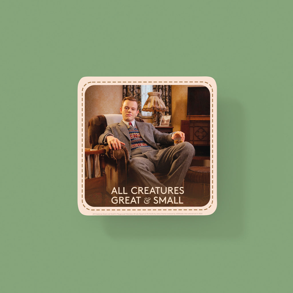 Bring a touch of classic British television to your home with this beautifully crafted coaster, featuring Tristan Farnon, the beloved character from All Creatures Great and Small. Whether you're a long-time fan of the series or new to the charming world of Darrowby, this collectible coaster is a must-have addition to your collection.